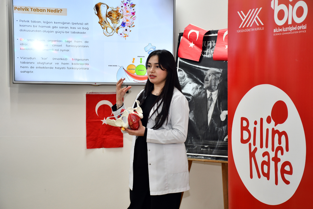 Stajyer Fizyoterapist Sümeyra Aydın Üriner sistem ile ilgili sunum yaptı. Böbrek ve mesane (idrar kesesi) gibi önemli organlara sahip olan üriner sistemle ilgili bilgi veren Aydın üriner sistemin görevlerinden bahsetti. Aydın’ın sunumunu bitirmesinin ardından Stajyer Fizyoterapist Kübra Coşkun pelvik tabanla ilgili sunum yaparken Stajyer Fizyoterapist Zeynep Işık idrar kaçırma tipleri ve nedenleri ile ilgili sunum yaptı. Seminer Stajyer Fizyoterapist İrem Özcan’ın idrar kaçırma problemini önlemek amacıyla yapılabilecek egzersizleri katılımcılara uygulamalı olarak göstermesiyle sona erdi.