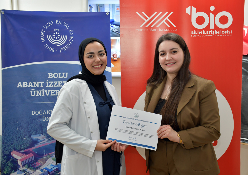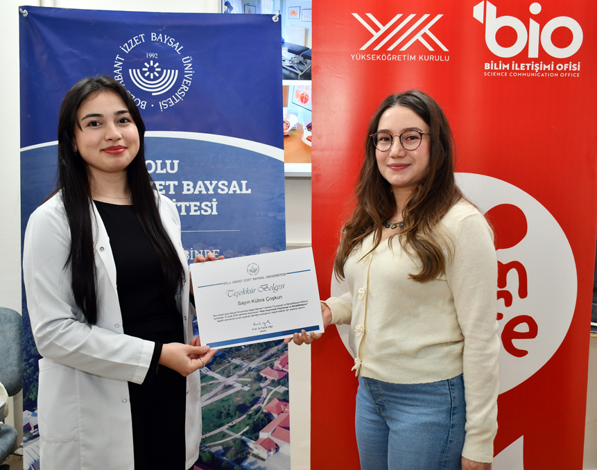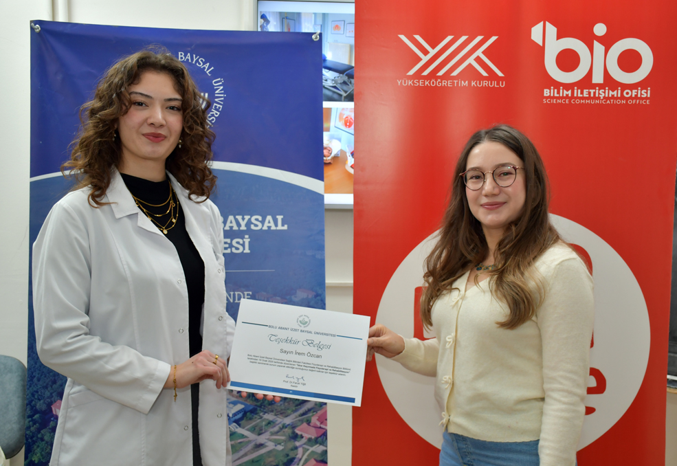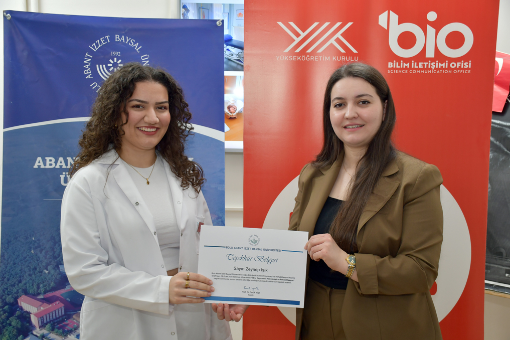 Seminerin ardından sunum yapan stajyer fizyoterapistlere ve Sağlık Bilimleri Fakültesi Öğr. Gör. Gözde Tekin’e teşekkür belgesi verildi.