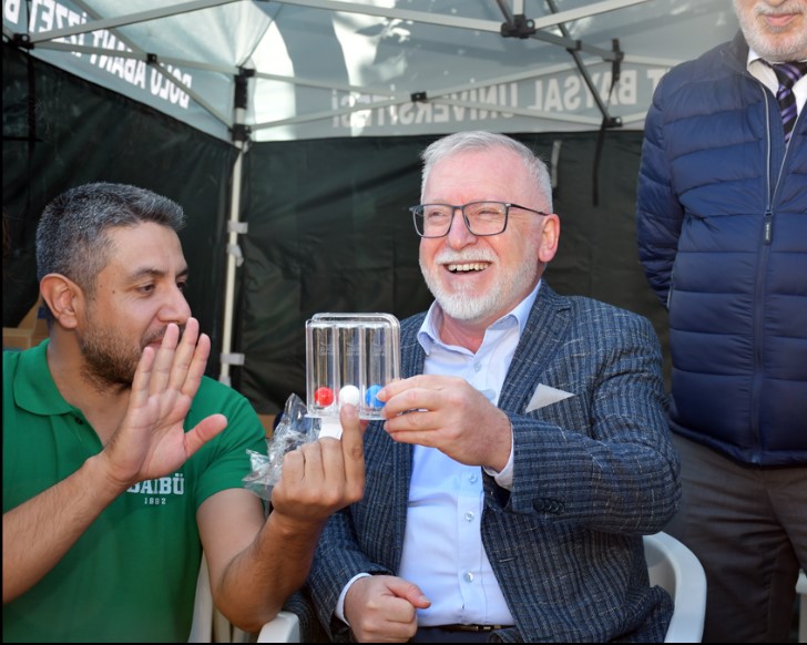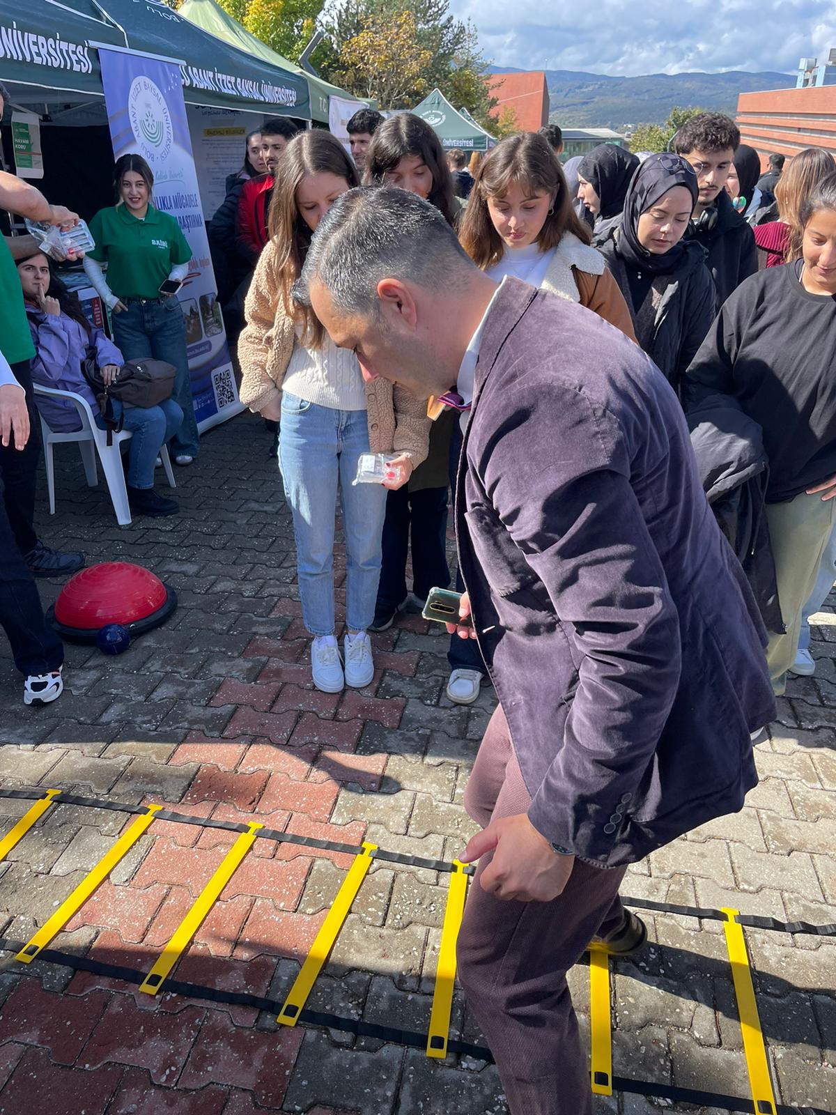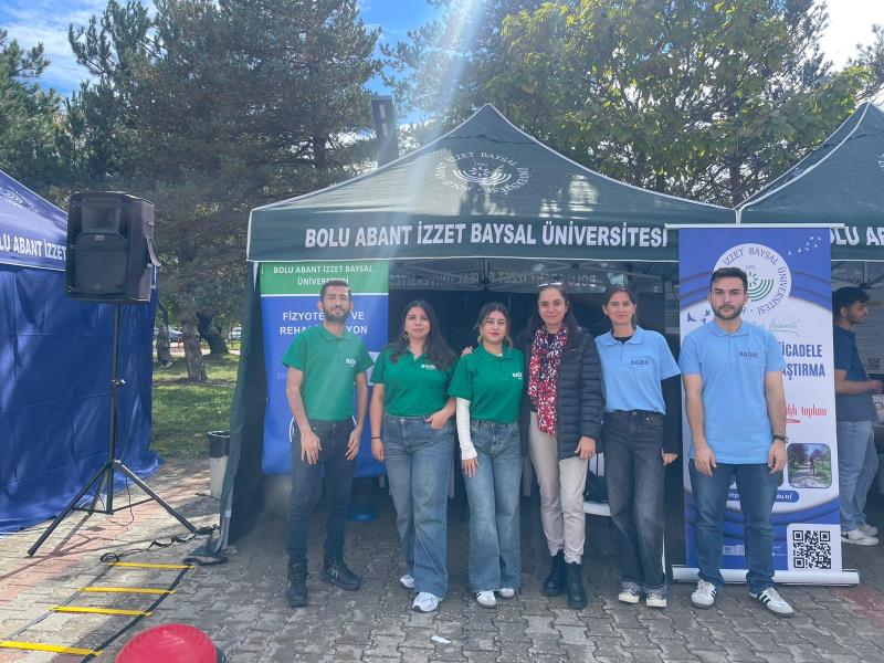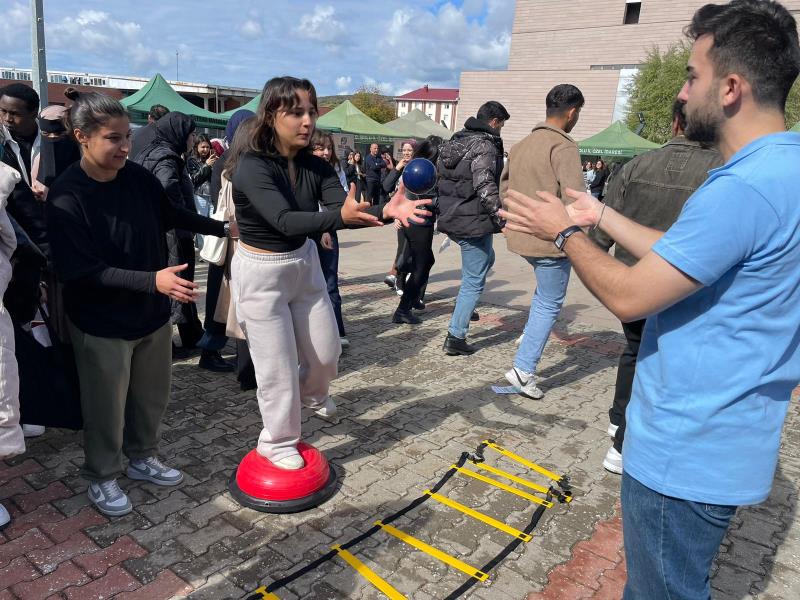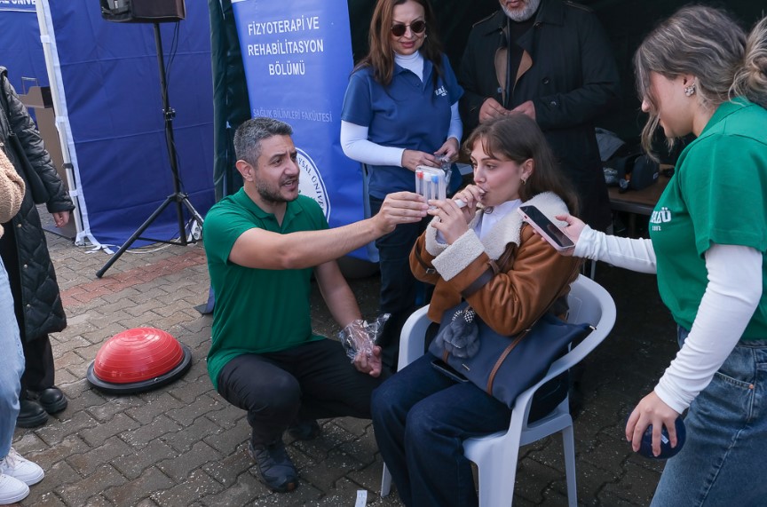 Fizyoterapi ve Rehabilitasyon Bölümü standında Dr. Öğr. Üyesi Alp Özel, Dr. Öğr. Üyesi Muhammet Fatih Uysal, Öğrencilerimizden Elif Büyükgüllü, İrem Tatar, Mohammed Najmaldin Saqee Altaie, Şeyda Özkaraca, Emircan Özcan görev aldı. Etkinlik kapsamında katılımcıların özel bir solunum egzersizi cihazı (triflo) ile nefes gücünü test etmeleri, yarım bir egzersiz topuna benzeyen bir top (bosu topu) üzerine tek ayakla çıkıp dengede durmaları ve farklı ağırlıklarda topu atıp geri göndermeleri istenerek denge-koordinasyon yeteneklerini test etmeleri, çeviklik merdiveninde belli bir modelde hareketi en hızlı sürede yapmaları gibi çeşitli egzersizleri yapmaları sağlandı, yarışmalar gerçekleştirildi ve birinci olanlara hediyeler verildi.